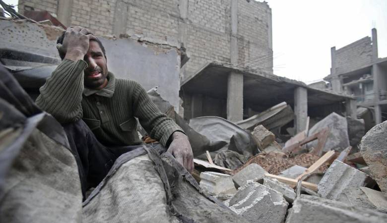 مدني سوري متحسراً على انقاض منزلة في الغوطة الشرقية