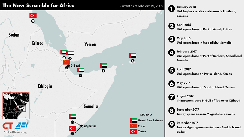 كما تولت الإمارات إدارة وتطوير ميناء بوساسو في ولاية بونتلاند شبه المستقلة في أكتوبر 2017.